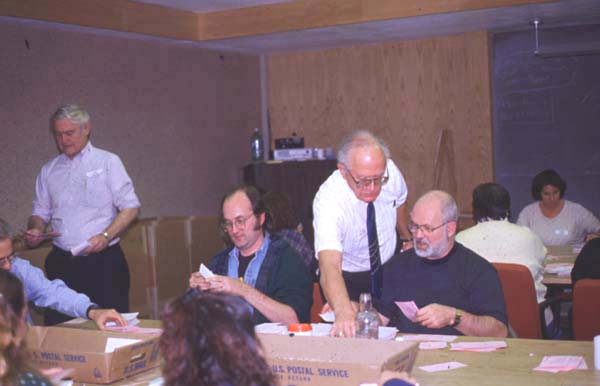 ![]() Under the supervision of the ARRL Committee of Tellers and an independent auditor, ARRL staff members sort ballots for the recent Board of Directors' election. Once sorted, ballots are counted by machine. |