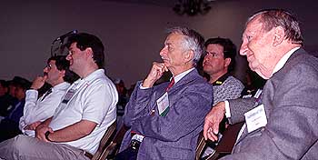 Among those turning out to hear the good news about Phase 3D at Dayton were (l-r) Frank Bauer, KA3HDO; Matt Bordelon, KC5BTL; past astronaut Owen Garriott, W5LFL--the first astronaut to use Amateur Radio from space--and former NBC correspondent and producer Roy Neal, K6DUE.