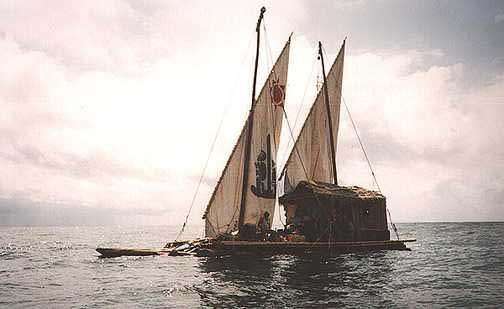 The raft La Mante-a under way in the Pacific.