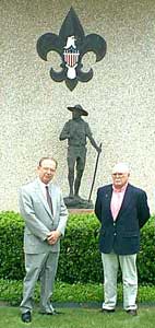 ARRL President Jim Haynie, W5JBP (left), and Atlantic Division Director Bernie Fuller, N3EFN, pose in front of BSA National Headquarters.