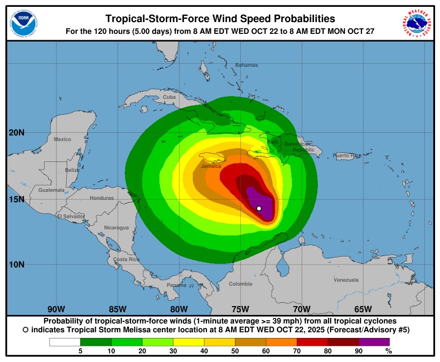Hurricane Melissa, now a category 5 storm, is expected to make landfall in Jamaica today, across southeastern Cuba Wednesday morning, and across the southeastern or central Bahamas later on Wednesday. Conditions are deteriorating on Jamaica with catastrophic winds, flash flood, and storm surge.